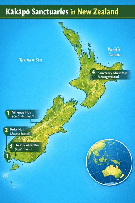 Autrefois répandu dans l’ensemble de l’archipel néo-zélandais, le kākāpō a vu son aire de répartition se réduire drastiquement après l’introduction de mammifères prédateurs. Aujourd’hui, il ne subsiste que dans quatre sanctuaires protégés et exempts de prédateurs :